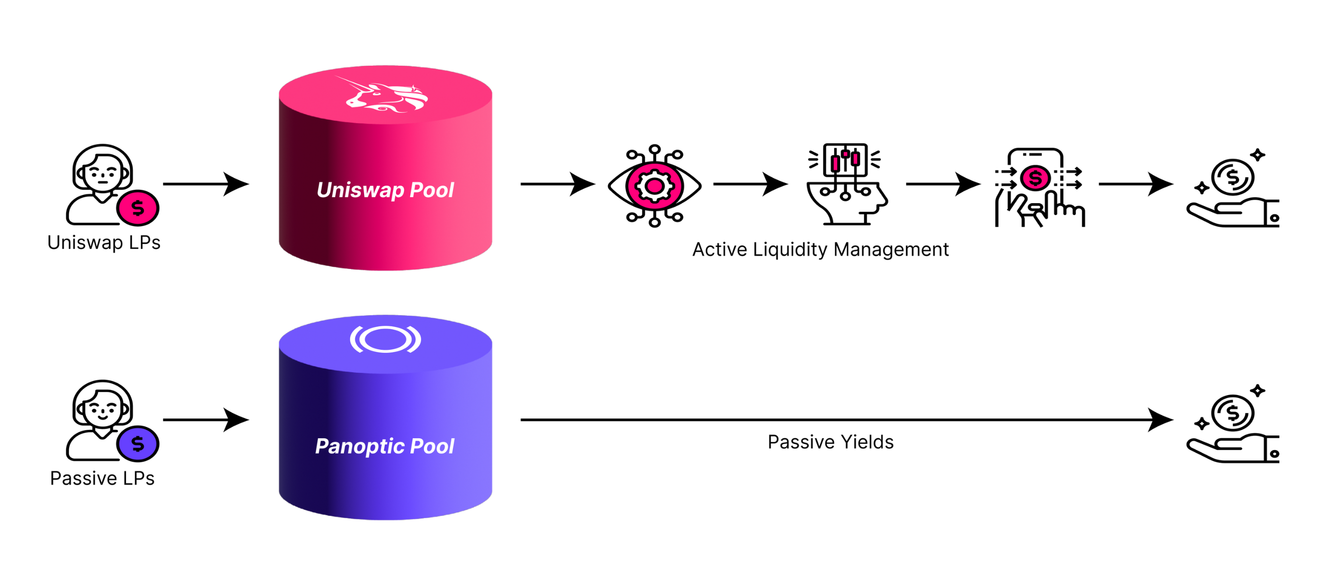 By lending out tokens to support Uniswap liquidity pools, passive LPs earn fees from borrowers. Passive LPs essentially provide liquidity to liquidity providers – LPception! 🤯 That means no need to make complicated decisions such as choosing a price range or rebalancing an out-of-range position. This is a game-changer for risk-averse participants who want to earn yield without worrying about the complexities of managing a two-token position.