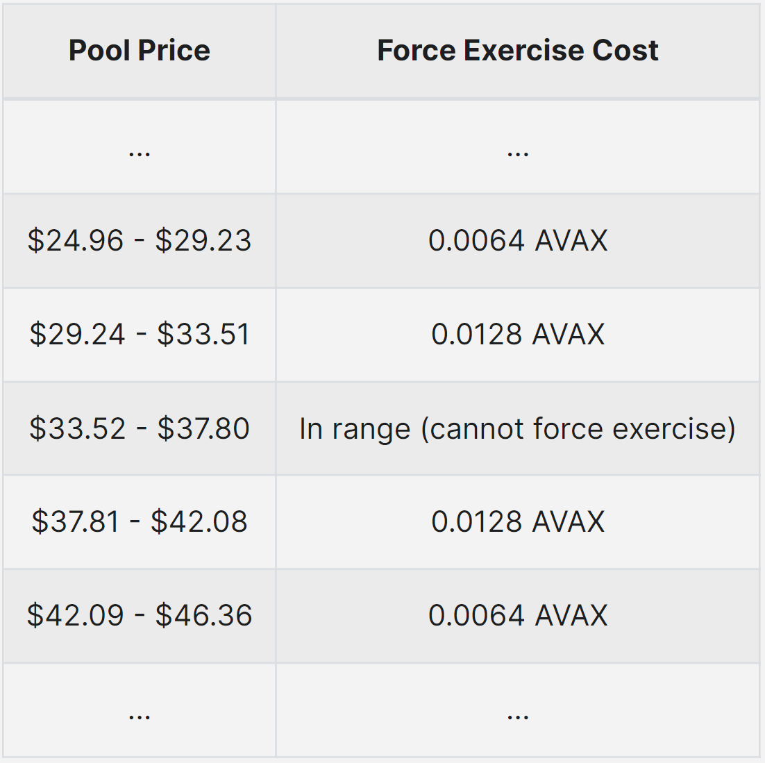 - The price of AVAX increases to $43. Because the price is now farther from the strike price, the force exercise fee is reduced from 128 bps to 64 bps so that the option can be force exercised for a fee of 0.0064 AVAX (64 bps * 1 AVAX).