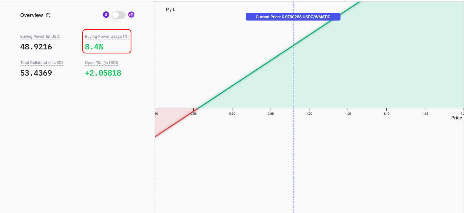 When buying power exceeds 100%, the trader’s account becomes liquidatable because their outstanding collateral requirement surpasses the value of their collateral.