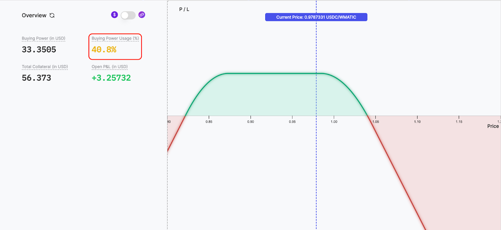 A trader becomes liquidatable if their buying power usage exceeds 100%. Panoptic’s market dashboard allows you to quickly monitor your total buying power usage for all your markets.