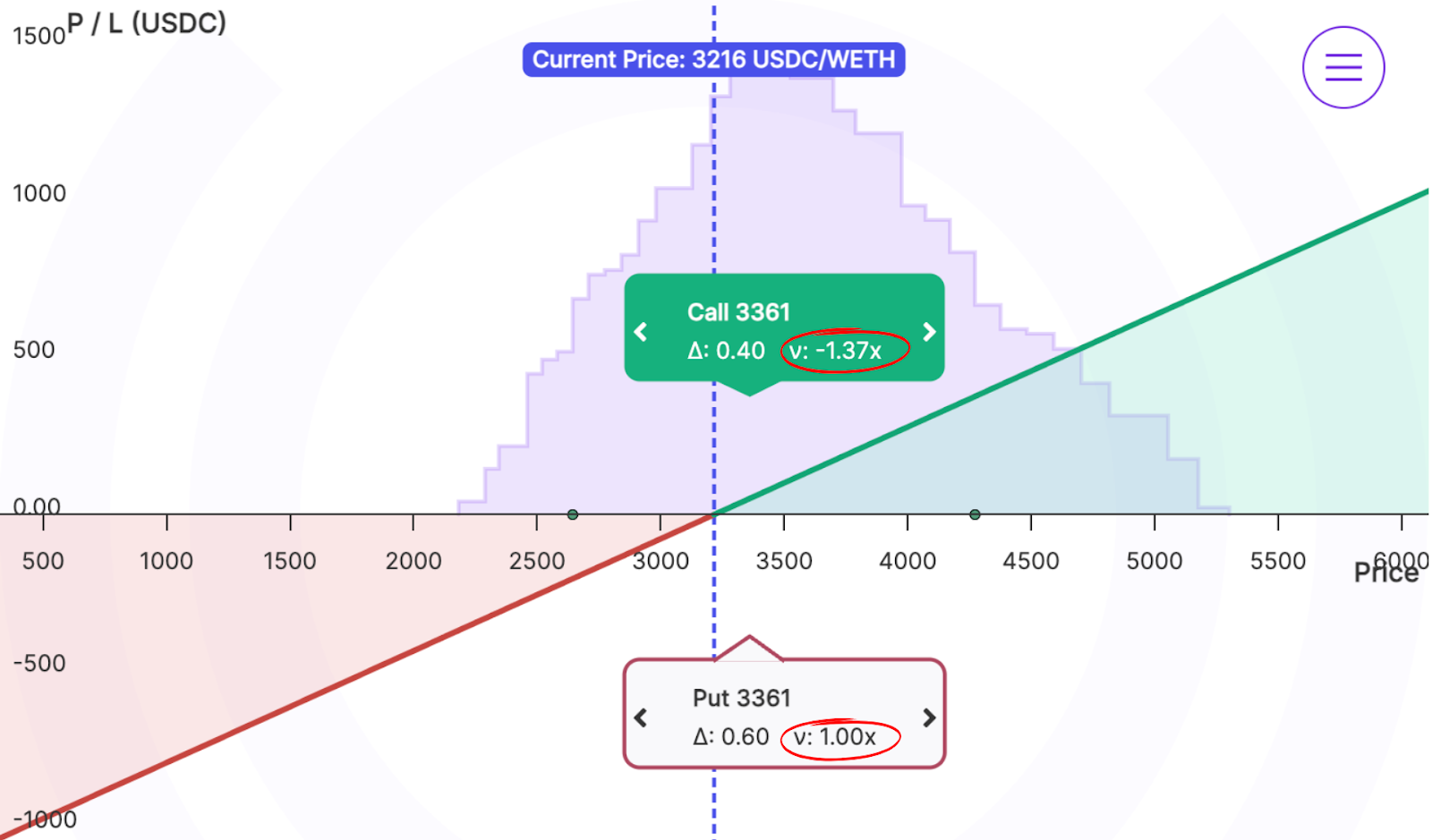The effective funding rate in this example is -0.37x of the Uniswap fees at each block. This rate is derived from the -1.37x multiplier contributed by the long call and the 1.00x multiplier from the short put, resulting in a combined spread multiplier of -0.37x.