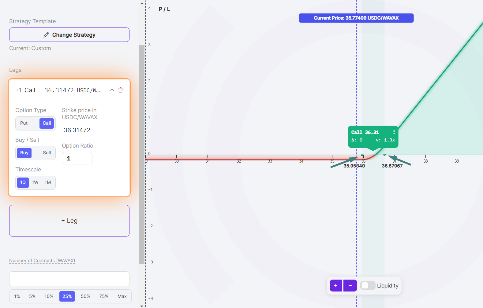 A one-day call option on AVAX, which earns streamia between $35.95 and $36.68:
