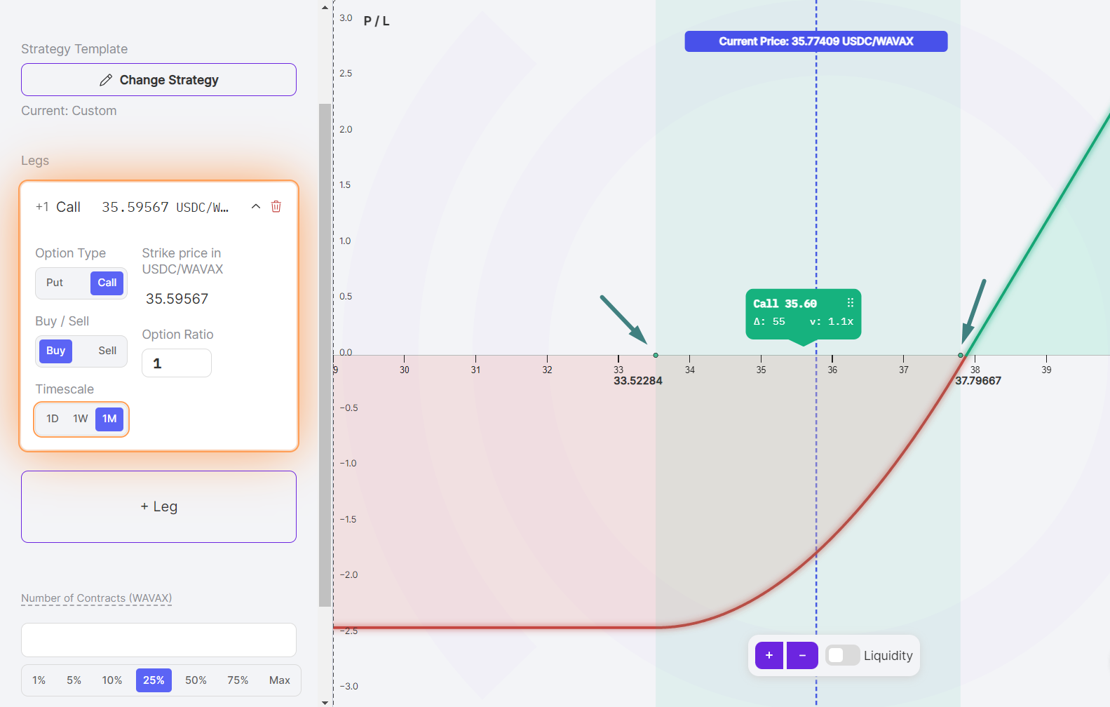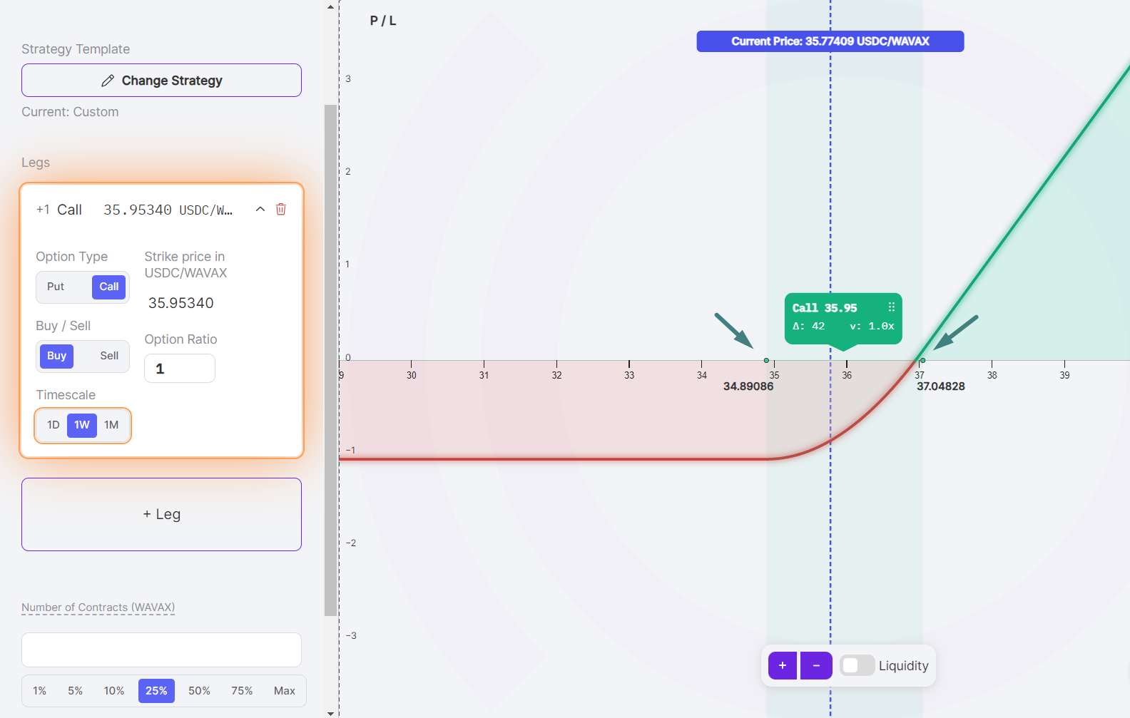 The example above shows a one-week timescale. The price range of the AVAX put is between $34.54 and $36.68. This option has a width of $2.14 (2.14 = 36.68 - 34.54). This means that the option will accumulate streamia as long as the AVAX price is between $34.54 and $36.68.