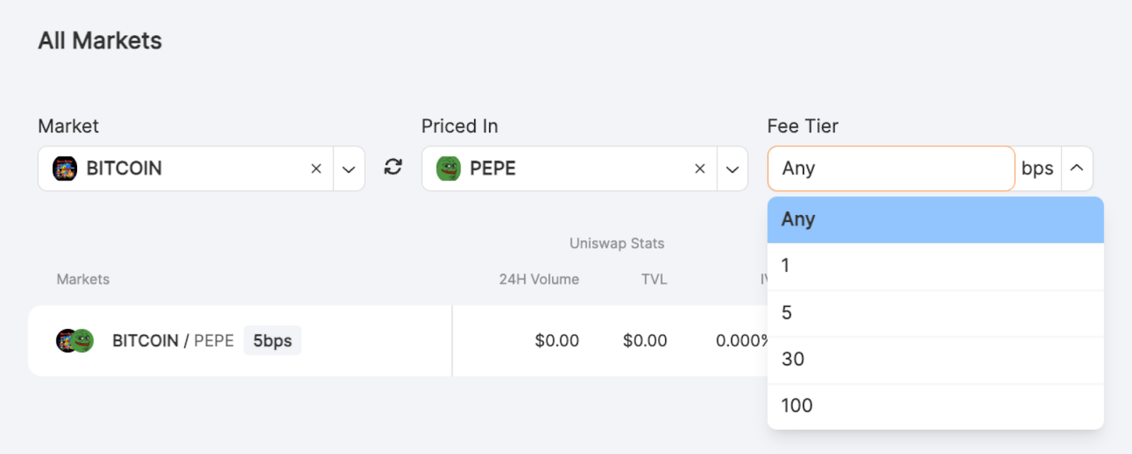 2. Pick Your Fee Tier: Select a fee tier corresponding to the Uniswap pool’s fee tier. Consider the Uniswap pool’s stability, liquidity, and volume to guide your decision. Use the table below as a general guideline: